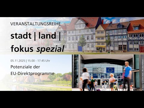 Im Rahmen einer Spezialausgabe unserer Reihe stadt I land I fokus haben wir ausgewählte Programmpunkte des EU-Fördermittelworkshops als Livestream für Interessierte in Niedersachsen bereitgestellt. Hierzu zählten Vorträge zum Mehrjährigen Finanzrahmen ab 2028 und mögliche Auswirkungen auf Städte und Regionen sowie zu den Förderprogrammen LIFE und CERV.